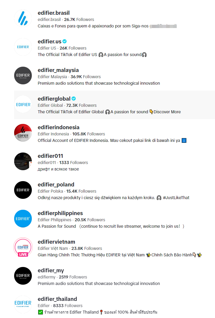 而深入探究漫步者(EDIFIER)的海外营销布局,能够发现TikTok是其重要的营销阵地之一。采取的是“广撒网”方式,即开通了多个TikTok账号同时运营,从结果来看,漫步者(EDIFIER)无疑是成功的,单个TikTok账号最高粉丝数达到了10.58万,总TikTok账号粉丝数则超过33万。