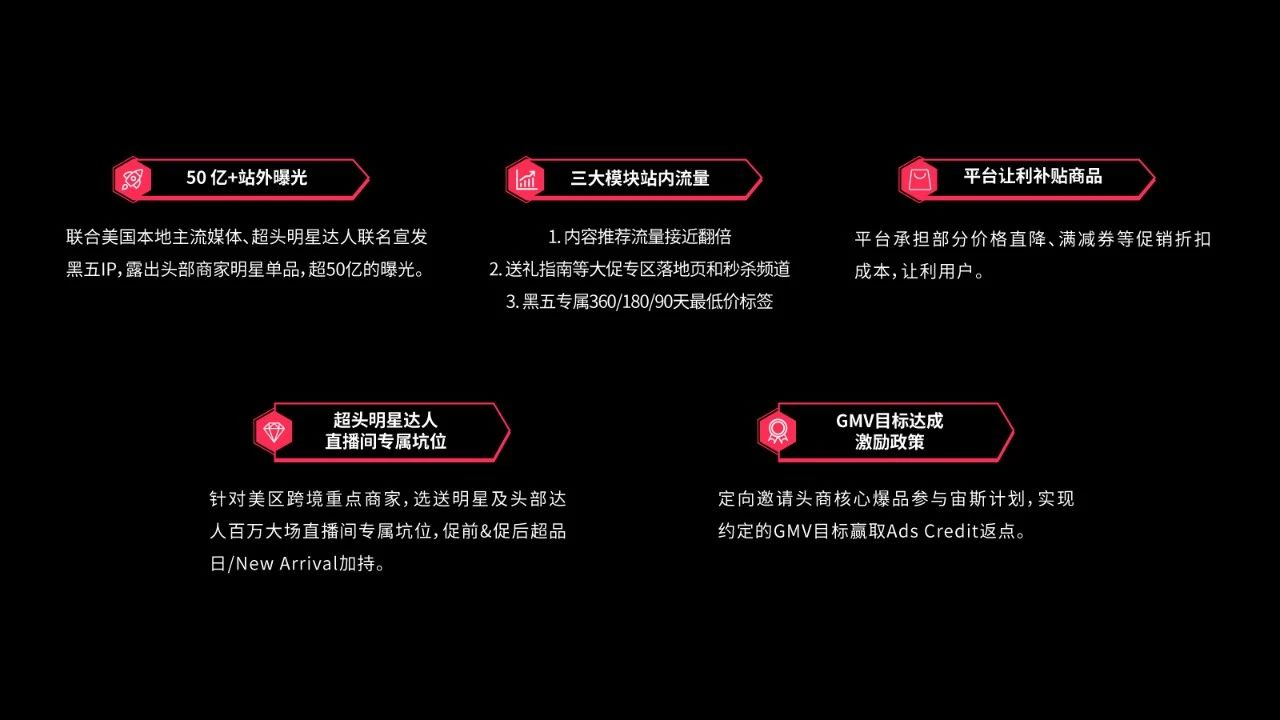 此外,TikTok Shop还推出了“宙斯计划”、“超头品牌计划”、“心智类目计划”和“爆品孵化计划”,这些计划通过提供优质达人资源、增加流量曝光和支持品牌孵化等方式,为商家创造更多销售机会。商家可以利用这些资源和平台提供的支持,最大限度地发掘黑五的商业潜力。