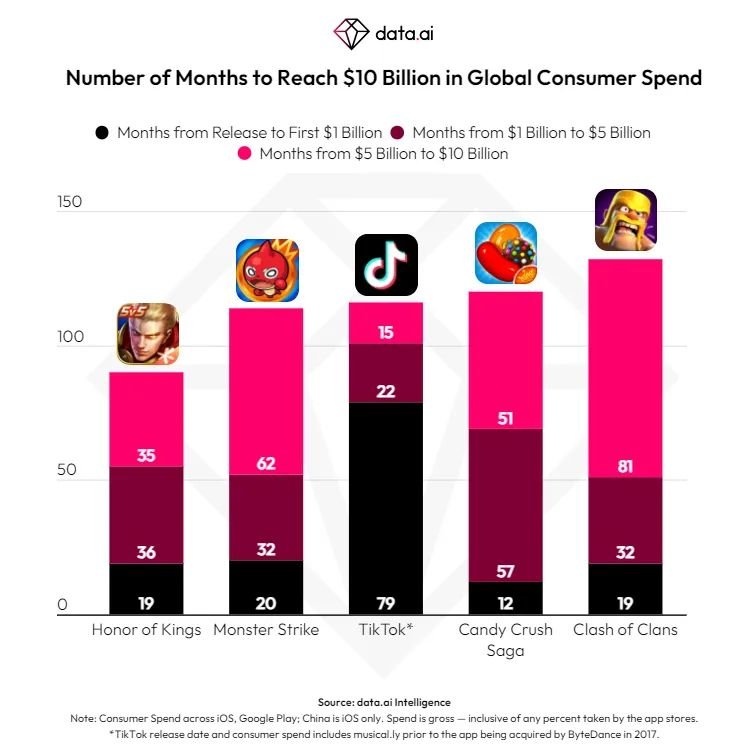 data.ai近段时间也发布报告,TikTok 2023年的累计用户支出已达到100亿美元,成为非游戏类应用的首个案例,也是全球第五款总收入达到百亿美元的手机APP。