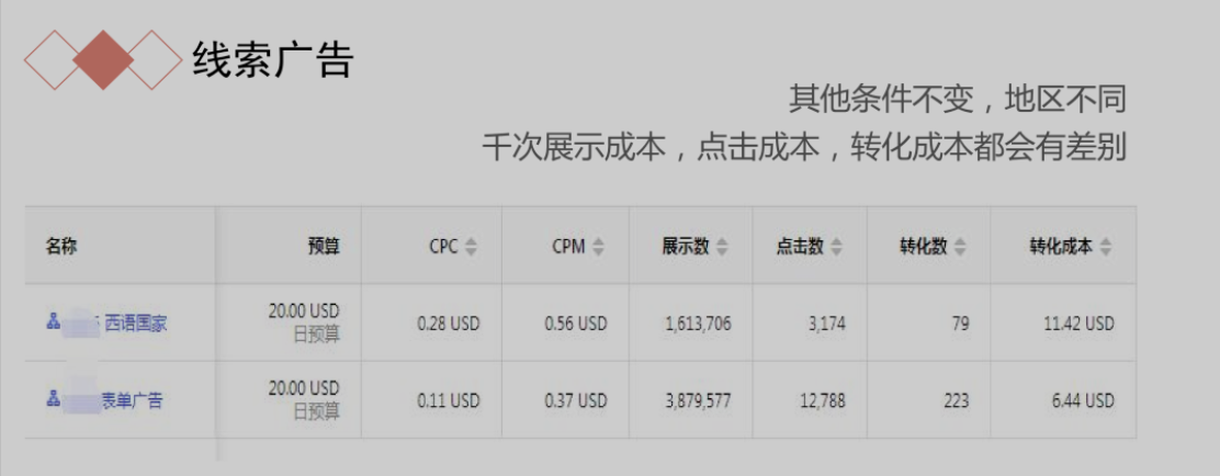 这边需要注意的是,在其他条件一样的情况下,当广告所投放的地区不一样,其展示成本、点击成本、转化成本都会受到影响而不一样。