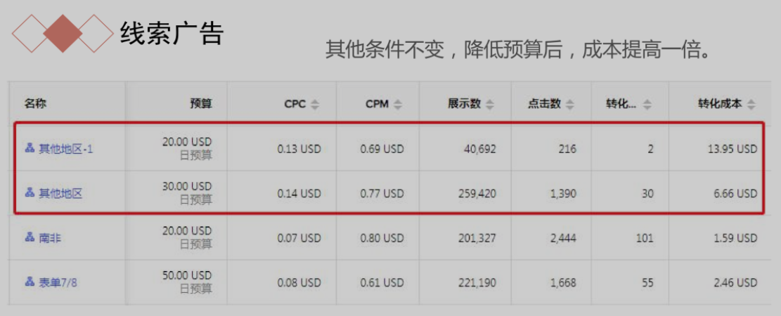 由于广告投放地区的不同,需要单独建立相应的广告组,同时需要注意:在其他条件相同的情况下,广告投放地区的不同会导致展示成本、点击成本和转化成本的差异。