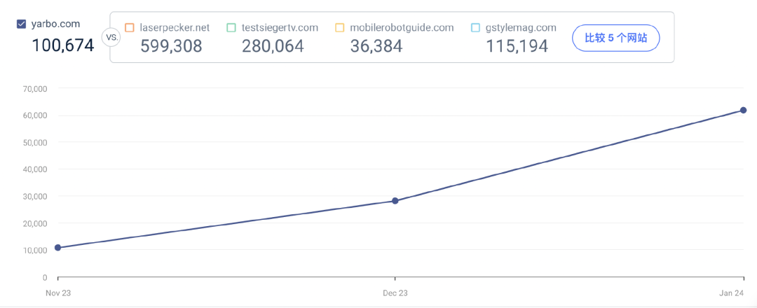 现在,随着产品关注度的增加,Yarbo独立站的流量也在稳步上升,在11月-1月的三个月里,其网站访问总量已经接近10万人次。