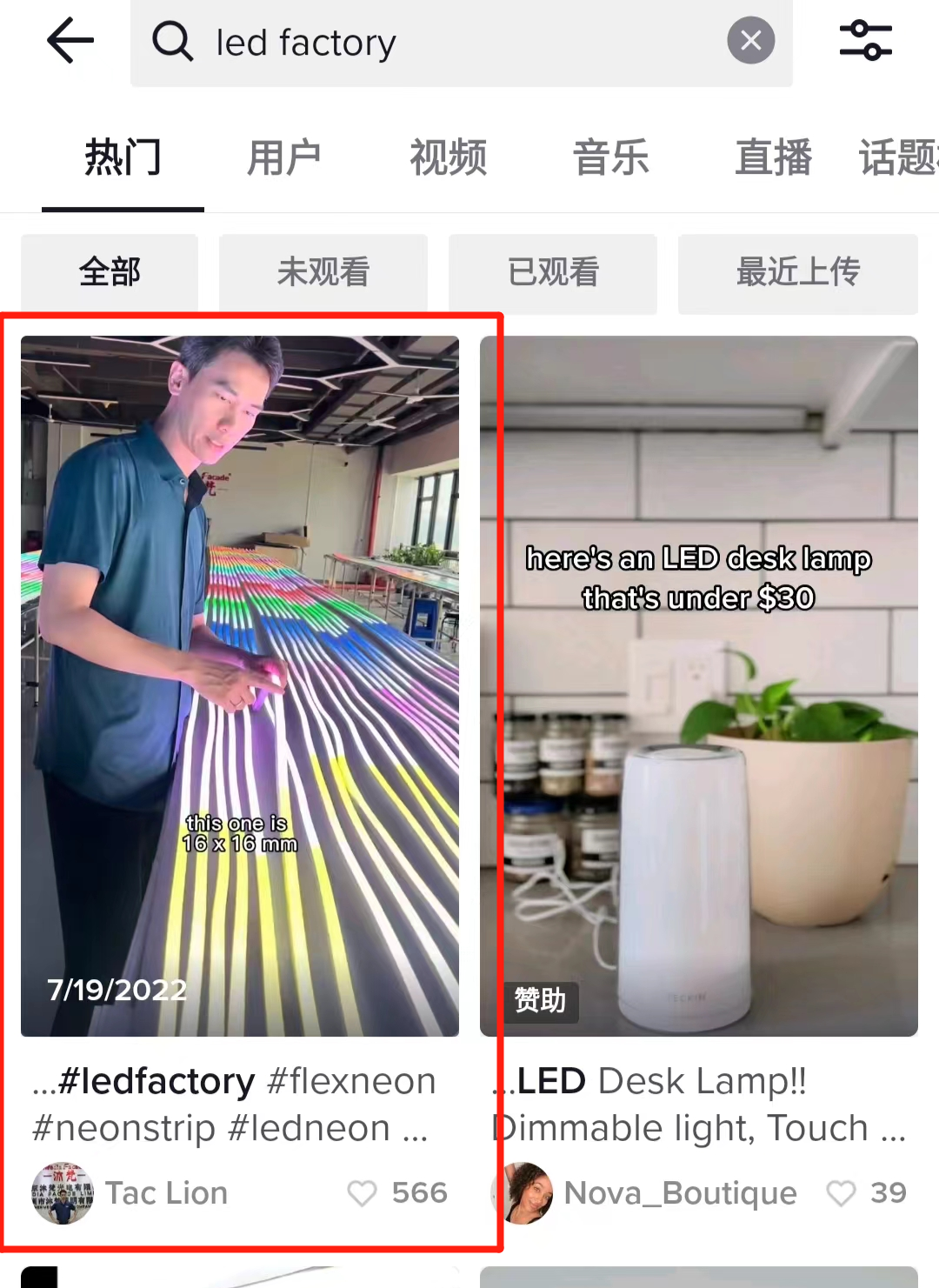 沐梵光电有限公司(TikTok账号名Tac Lion)是一家位于深圳的LED显示屏公司,他们在TikTok上取得了大量的曝光量和线索获取,搜索“led factory”时排在首位的TikTok账号就是他们的。