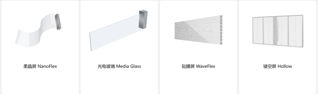 柔晶屏、光电玻璃、微格栅屏(M7)、立体3D大屏 (MTD)、创意软屏 (MCF)、网格屏