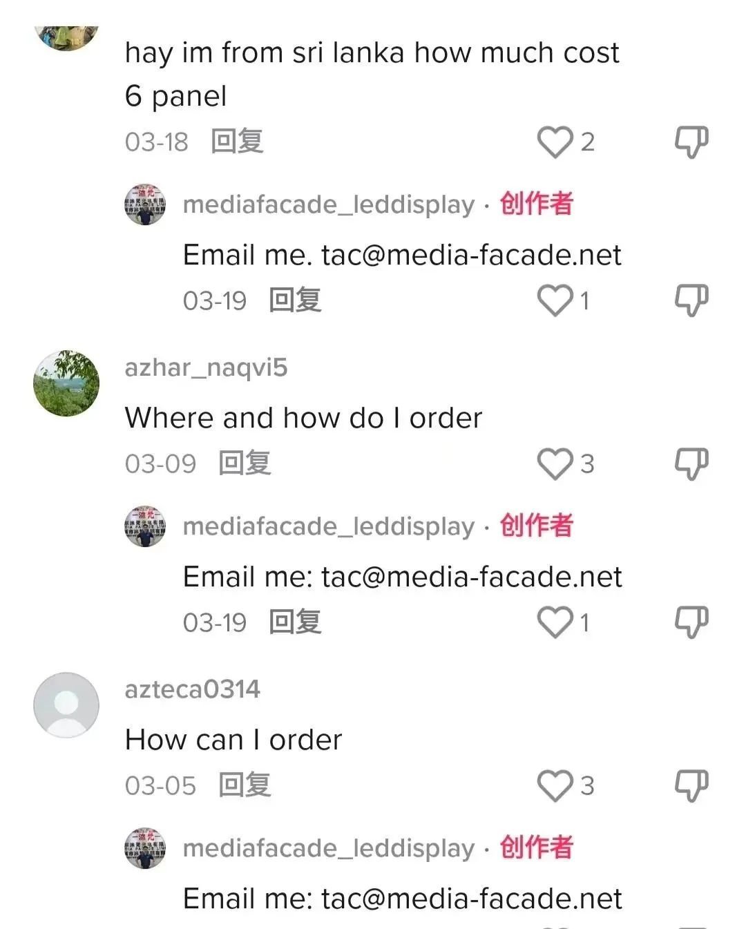 通过视频,目标受众可以了解到感兴趣的LED产品,并在评论区询问产品相关信息,或者直接通过主页进入公司网页查看在售产品,或者留下个人信息与后台客服联系。