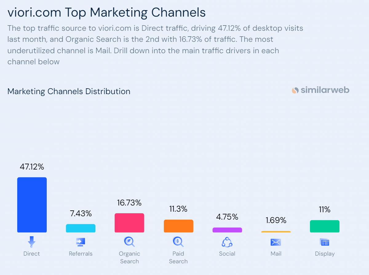 Viori独立站每月的访问量约为20万,主要消费群体来自美国。其流量分布较为均衡,直接流量占47.12%,自然搜索占16.73%,付费流量占11.3%。这些数据表明Viori的运营策略已经非常成熟,流量渠道多元化。