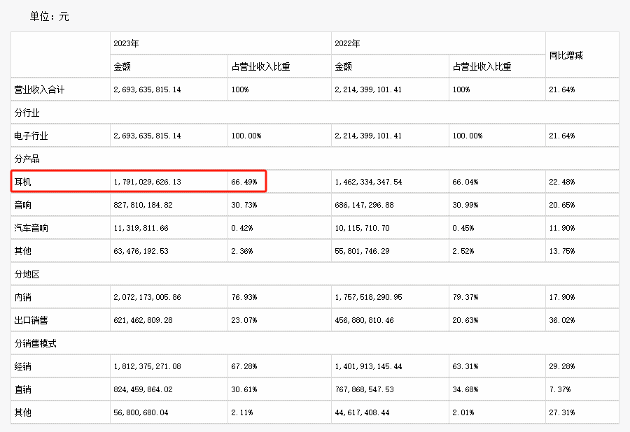 排名第2的是音响产品,在2023年营收为8.27亿元,占总营收的30.73%,同比去年增长20.65%。