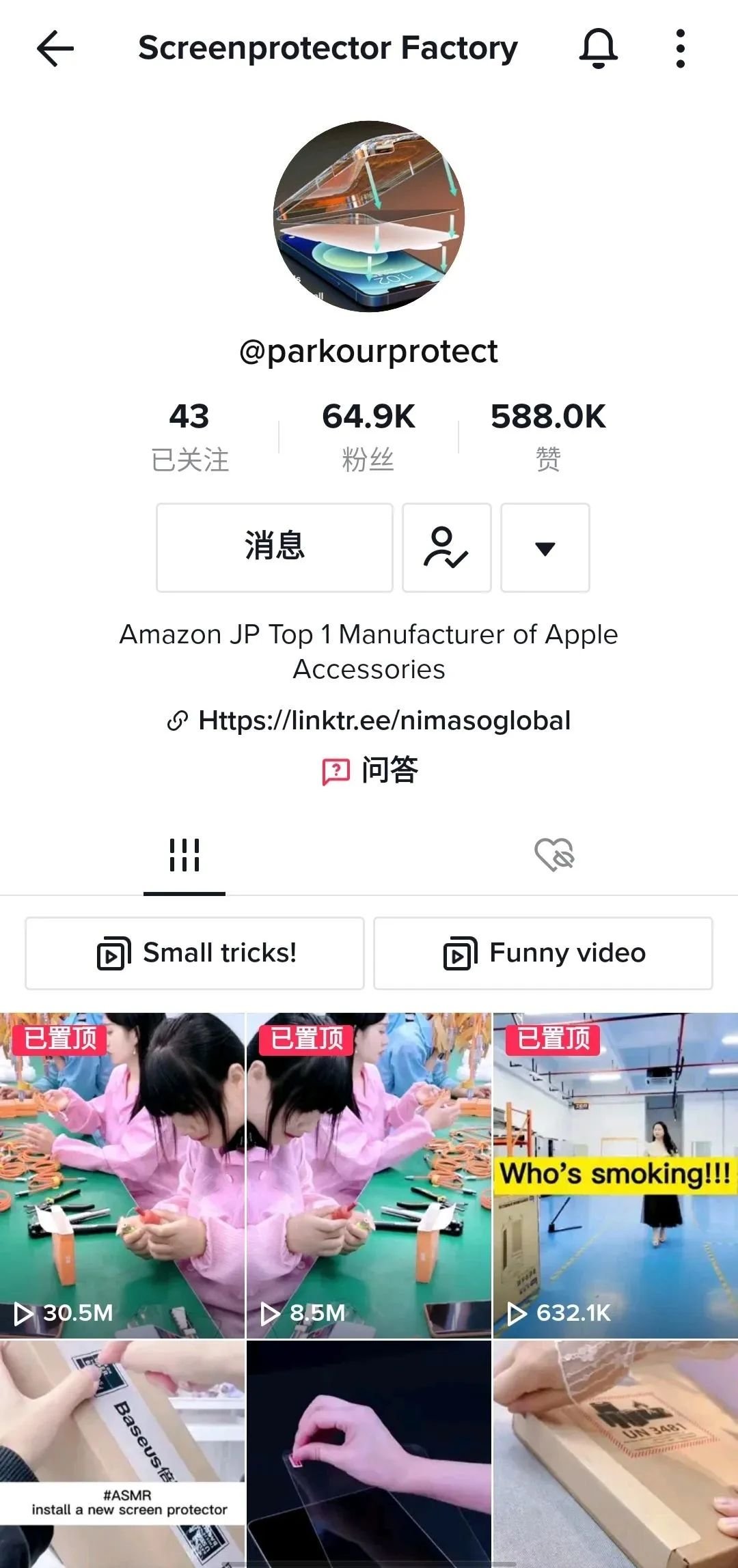 品牌需要准确把握在 TikTok 上分享的内容类型,而TikTok大多数视频都需要娱乐和吸引受众。屏幕保护工厂通过拍摄以生产车间为背景的有趣小视频来吸引受众眼球来达到引流目的,在搞笑视频中又穿插手机配件说明。