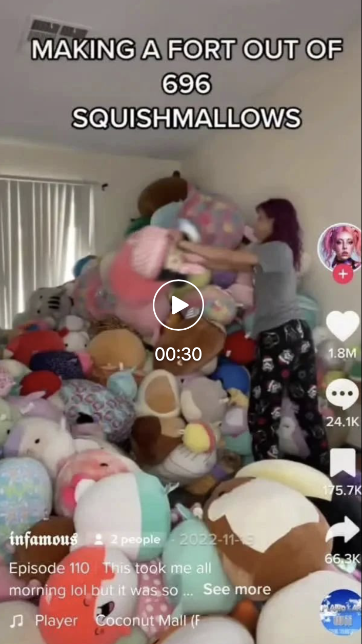 这条视频是由TikTok博主@infamousbutterfly在2022/11/19发布的,视频中博主在整理收纳Squishmallows的毛绒玩具,数量非常多,引来不少网友羡慕的眼光,该视频发布后已经获得了1870万播放量、180万点赞量、6.6万分享量、2.4万评论量。