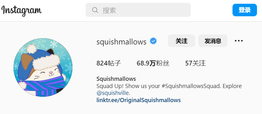 Squishmallows品牌除了在TikTok拥有粉丝外,在Instagram,Facebook等社交媒体上获得近百万粉丝,其中Ins拥有68.5万。
