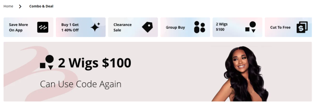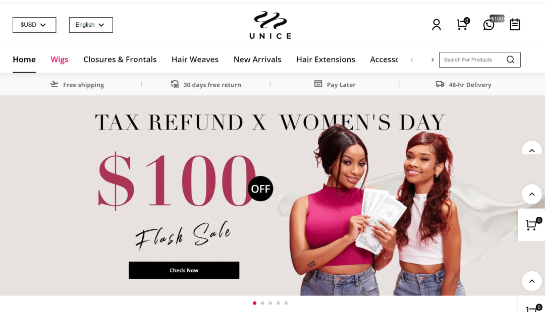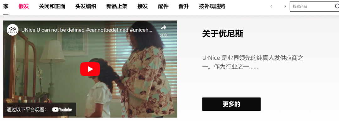 浏览UNice官网时,你会立刻注意到醒目的横幅广告,以及首页上左右滑动的假发模特照片和促销优惠文字。