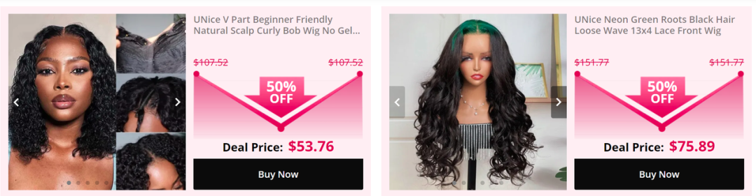 在产品分类方面,UNice注重精细化分类,并根据问卷调查的数据反馈和客户喜好进行产品开发。他们迅速推出了各种不同质地和造型的假发产品,以满足客户的需求。