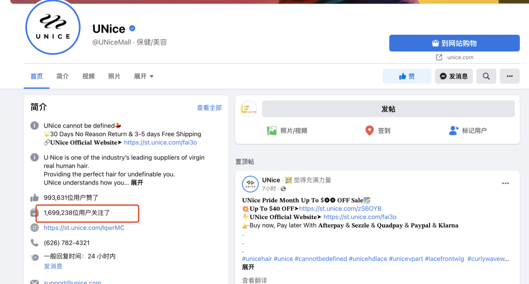 在Facebook上,UNice会发布产品介绍视频和简短的文字进行营销的帖子。此外,他们还会发布活动预告,包括各种折扣优惠,以进一步刺激社交媒体上的粉丝进行消费,并将他们引流到官方网站。