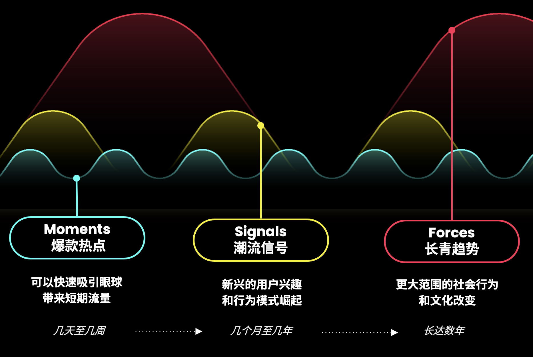 区别于过往趋势项目对于短期爆款热点的追踪,本报告旨在将视野放大,以更加宏观的全年维度帮助营销人了解消费者需求变迁,并解析它们会如何影响 TikTok 平台内外的营销策略。我们基于2022年海量的 TikTok 原生视频研究,聚焦生命力更⻓、影响力更大的潮流信号(Signals)和⻓⻘趋势(Forces),总结了消费者行为和创意背后的规律,对每一个核心趋势进行解读。