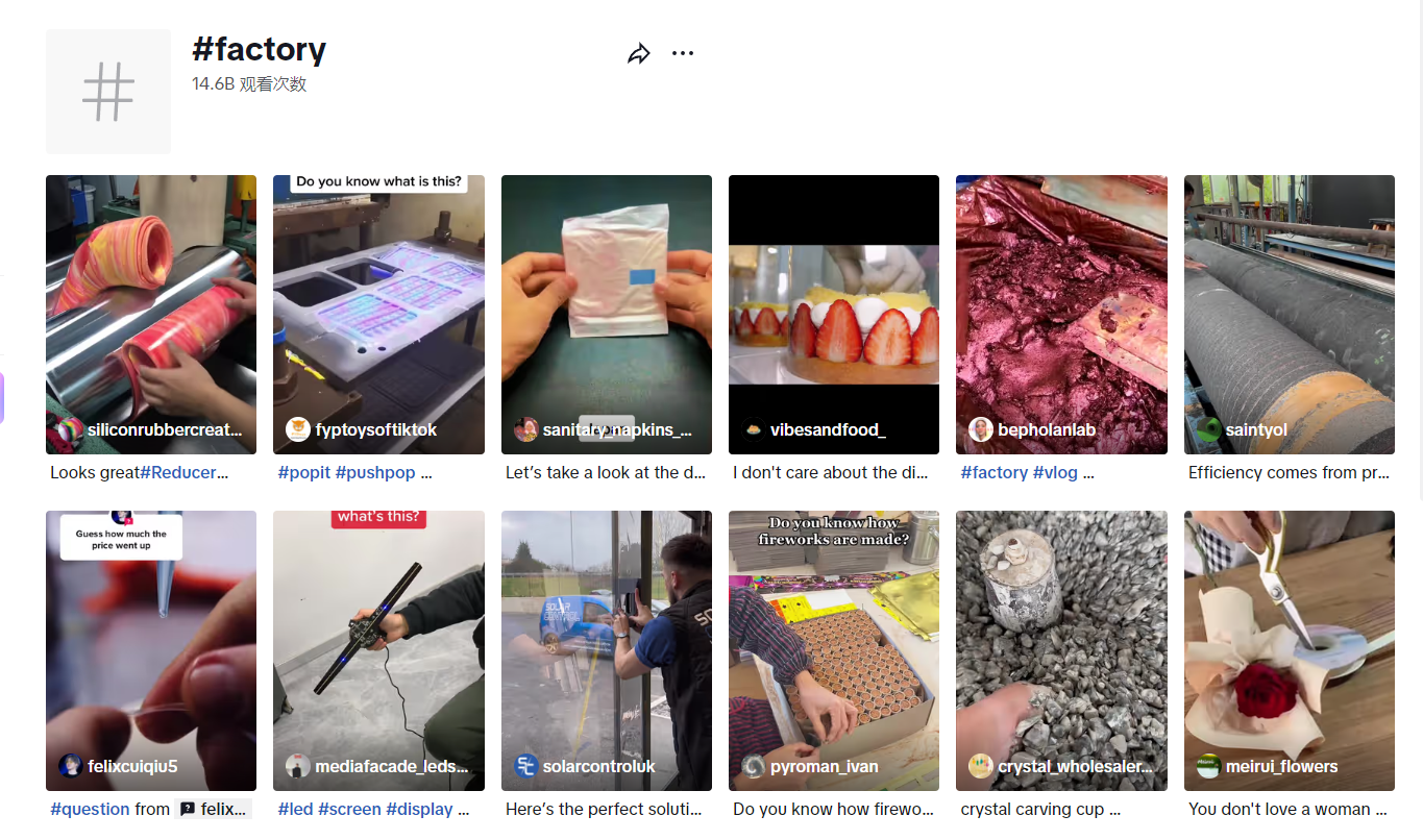 搜索#factory,可以发现在TikTok上,该话题的相关视频观看次数,已经突破146亿,涉及服装、美妆、灯具、玩具、食品、五金等各个行业。