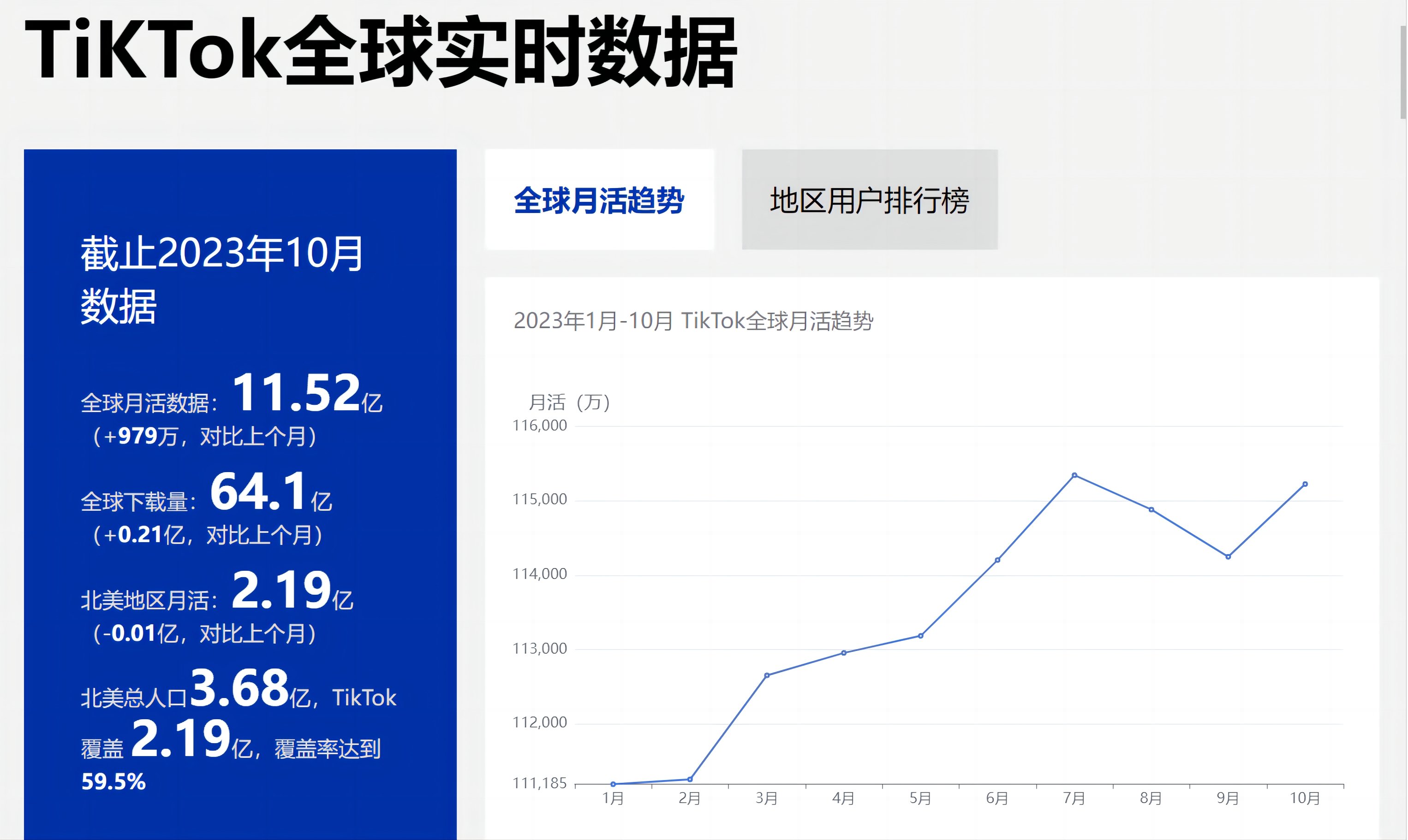 根据启航出海官网显示的10月TikTok数据,TikTok在全球的月活数已经达到了11.52亿,成为世界顶尖的社交媒体之一。
