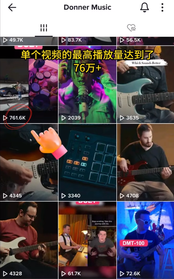 目前,Donner Music的视频内容,单个播放量最高达到了76万+,成功地吸引了广泛的受众群体,包括初学者和专业音乐家。
