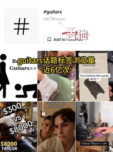 Donner Music目前的转化形式是Linktree链接树分流,通过不同乐器标签分类来实现转化。在TikTok上,#guitars(吉他)话题标签的浏览量近6亿次,#electronicdrum(电子鼓)话题浏览量也有近2千万。