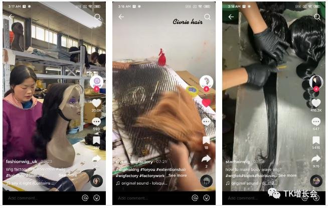 同样以假发工厂为例,档发、开料、双针、过酸、清洗、压色、打发这些生产假发的工艺,对于外行人来说都是非常新颖的东西,这样的广告内容可以引来TikTok上大数据的关注,为账号注入更多流量,从而更容易获取到客户。