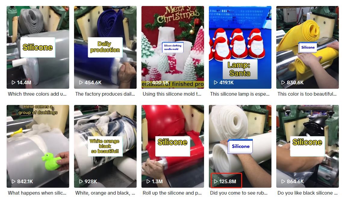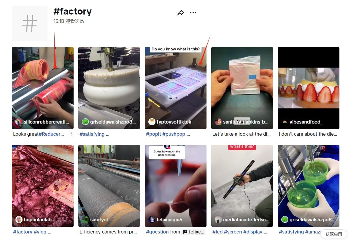 你们都不敢想象标签#factory在TikTok上有多火,观看次数高达151亿次!而且在搜索#factory出现的前十自然排名结果中,硅胶制作相关视频内容占了两条:一个播放量1.28亿,一个播放量2890万。