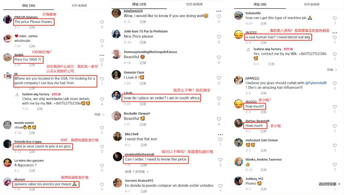 从下图我们可以清晰地看到,该品牌工厂TikTok账号@fashio_wig_factory发布的视频的评论区,有大量客户留言询盘价格是多少?该怎么下单?可见客户对于该工厂的假发产品十分认可,且有极大的购买需求!