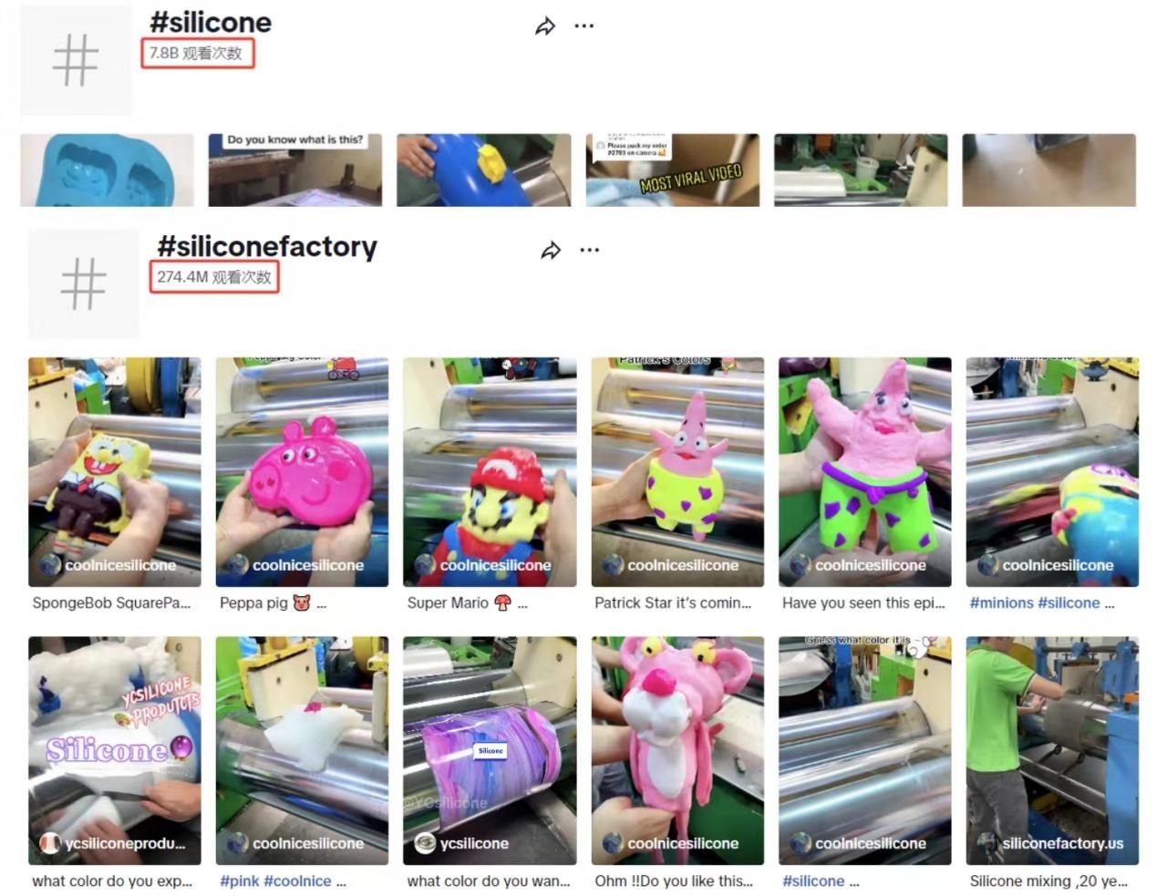 就拿硅胶工厂来说,搜索标签#silicone(硅胶),观看次数高达78亿,搜索标签#siliconefactory(硅胶工厂),观看次数也有超2.74亿。
