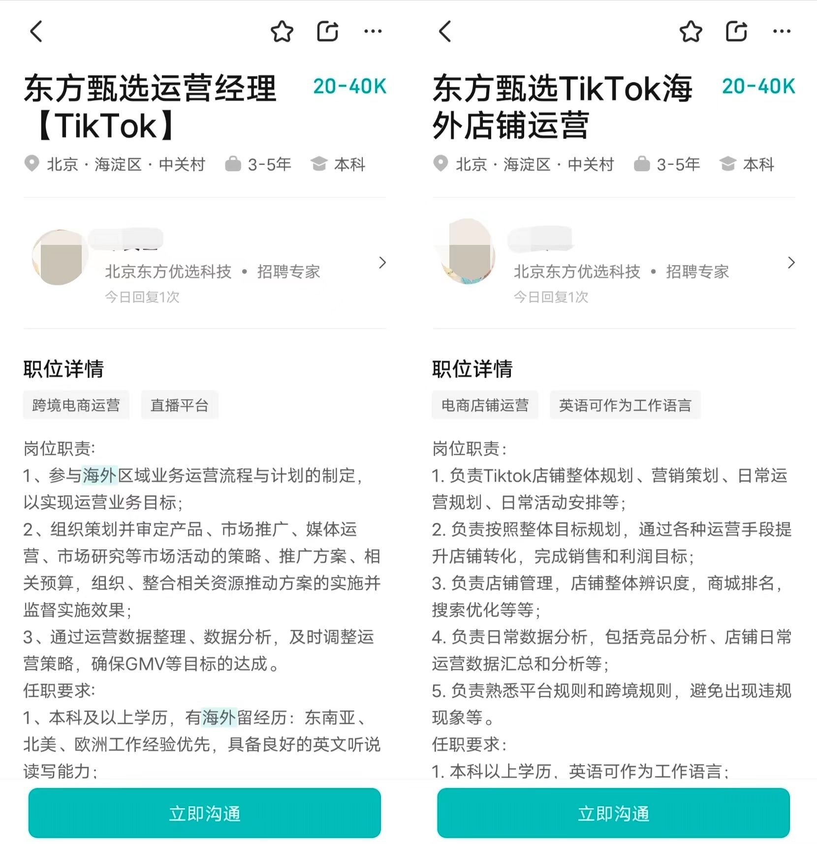 不过不是因为新一波的“小作文”事件,而是因为东方甄选已启动TikTok相关职位的招聘,包括TikTok运营经理、商务经理、海外店铺运营等岗位,而且月薪介于20K至40K元之间。