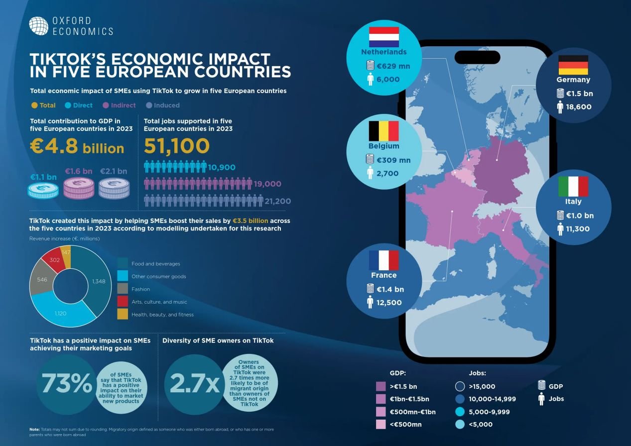 该报告指出,欧洲的中小企业在2023年已经通过TikTok,为欧洲五个国家(比利时、法国、德国、意大利和荷兰)的经济贡献了48亿欧元,提供了超51000个就业岗位。
