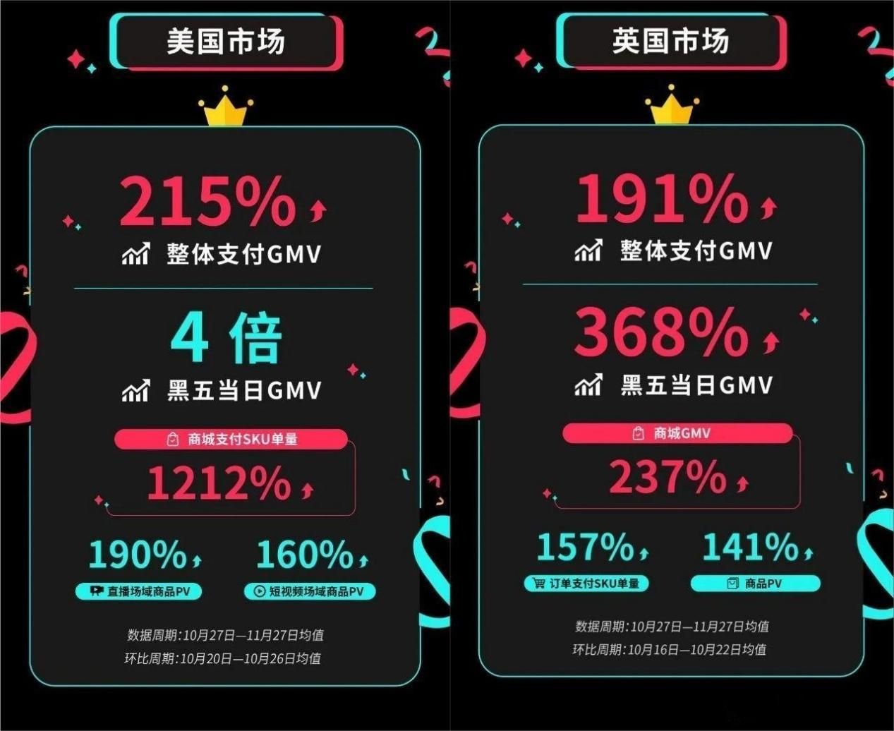 据TikTok Shop黑五大促统计数据,从10月27日至11月27日期间,其美国市场的整体支付GMV增长了215%,黑五当日GMV更是增长了4倍,展现出巨大的市场潜力,也吸引了更多的跨境商家入局。