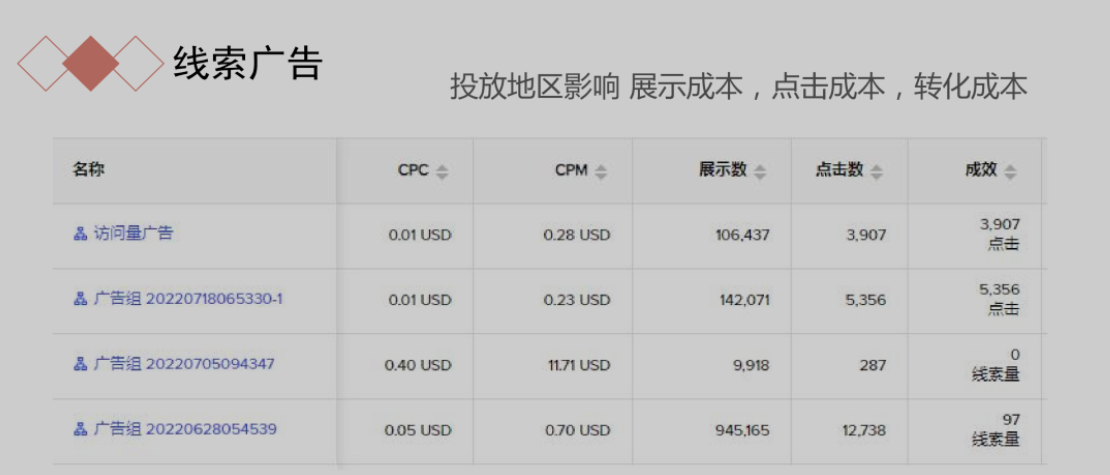 这边需要注意的是,在其他条件一样的情况下,当广告所投放的地区不一样,其展示成本、点击成本、转化成本都会受到影响而不一样。