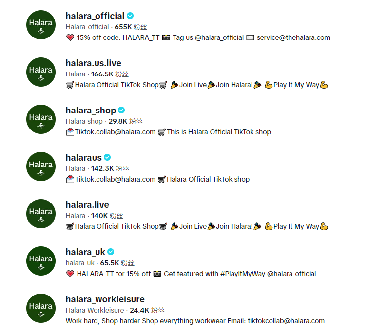 Halara在TikTok上的社媒矩阵 图源:TikTok