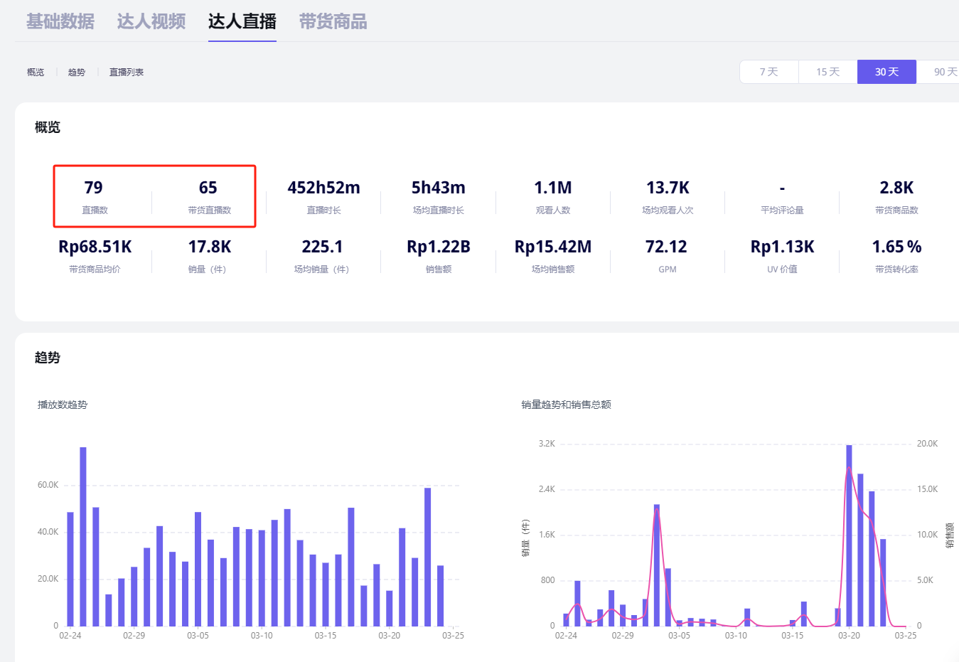 过去7天,Focallure Indonesia直播了15场。而在过去30天,其直播场次达到了79场,其中65场为带货直播。