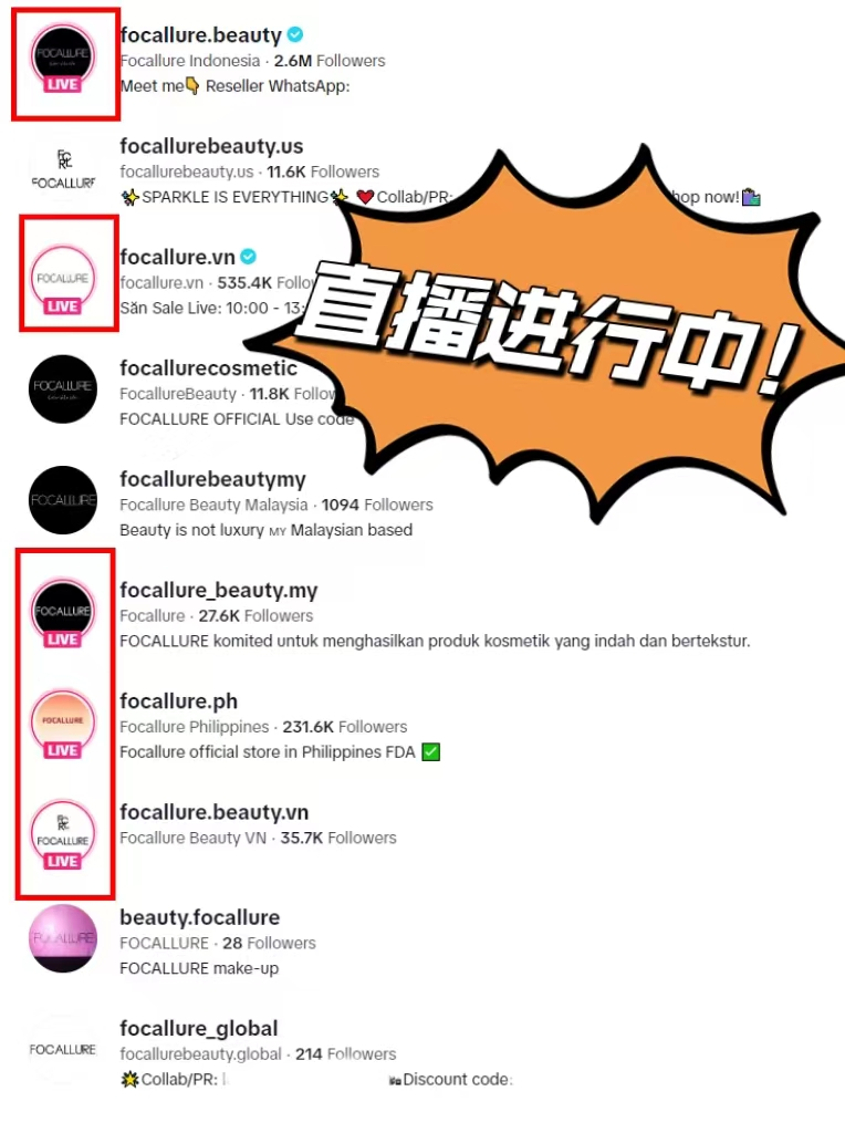 对于一些新手账号来说,初始阶段直播的效果可能不理想,那就可以学习FOCALLURE进行多账号开播,以更好地增加曝光,吸引用户进来将其转化为粉丝。