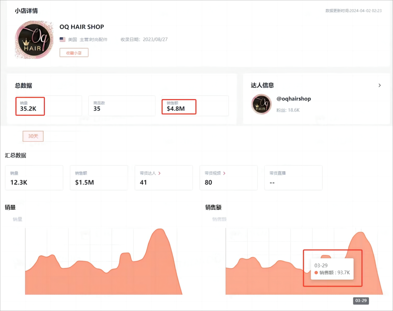 OQ HAIR SHOP是一家美国本土假发品牌,小店自去年8月末入驻TikTok Shop美国站。截至4月1日,小店总销量为3.52万件,总销售额约为480万美元。