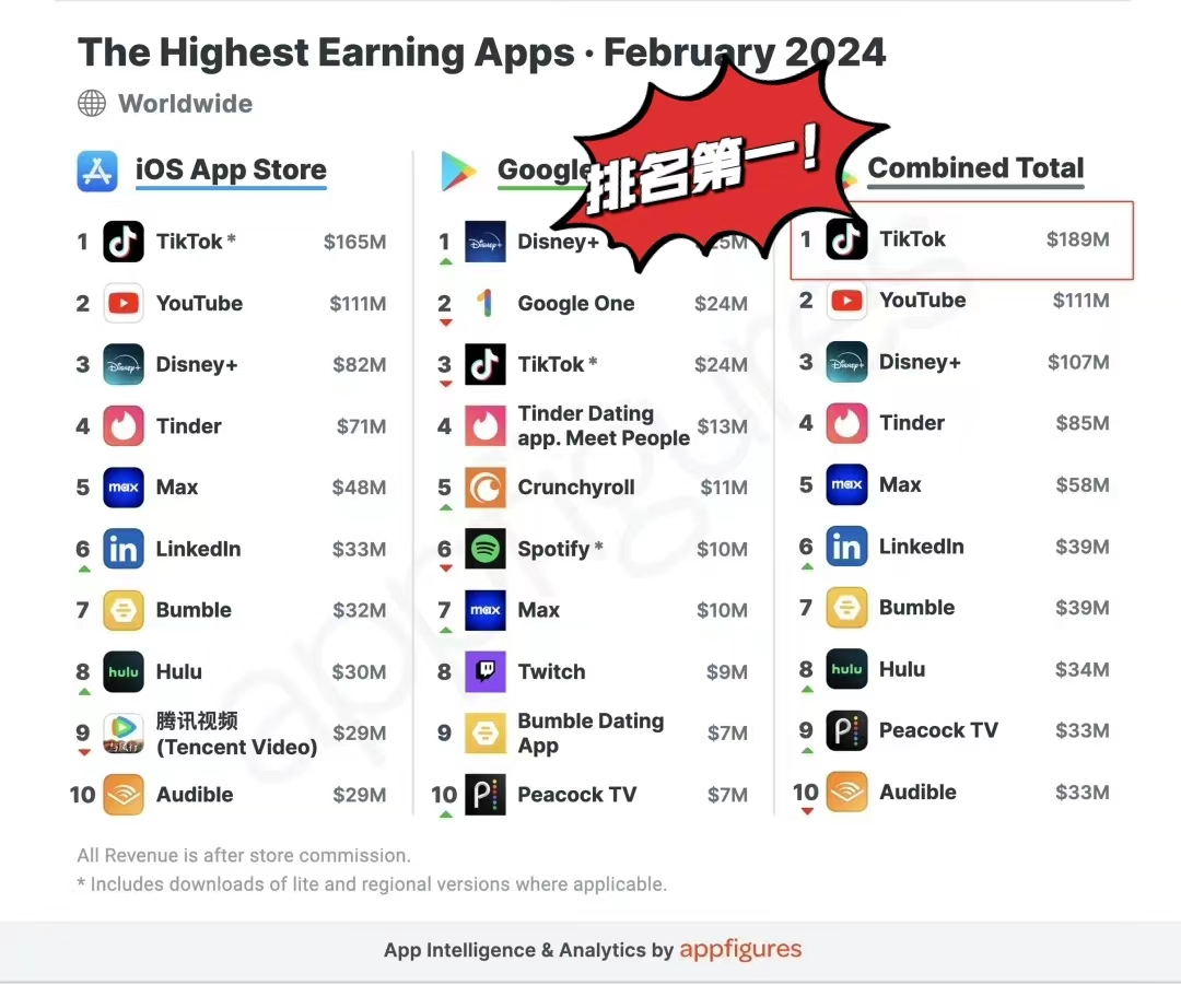 据知名财经媒体福布斯近日报道,今年2月,TikTok以惊人的1.89亿美元全球收入再次荣登全球应用收入榜首,紧随其后的是收入1.11亿美元的YouTube。