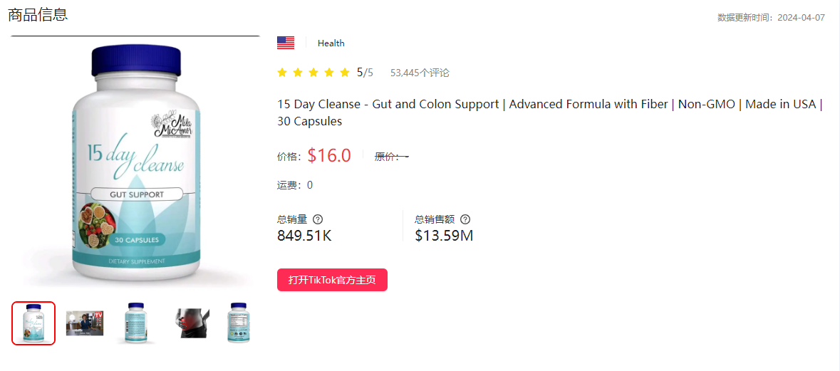 除此之外,保健品依靠TikTok获利的例子并不算少见,在TikTok Shop日销榜上排名第二的“15天肠道清洁保健胶囊(15 Day Cleanse)”也是一款靠细分赛道畅销的保健品(见我之前的文章《保健品的市场这么强?月销百万,TikTok美区这个小店火了!》)。