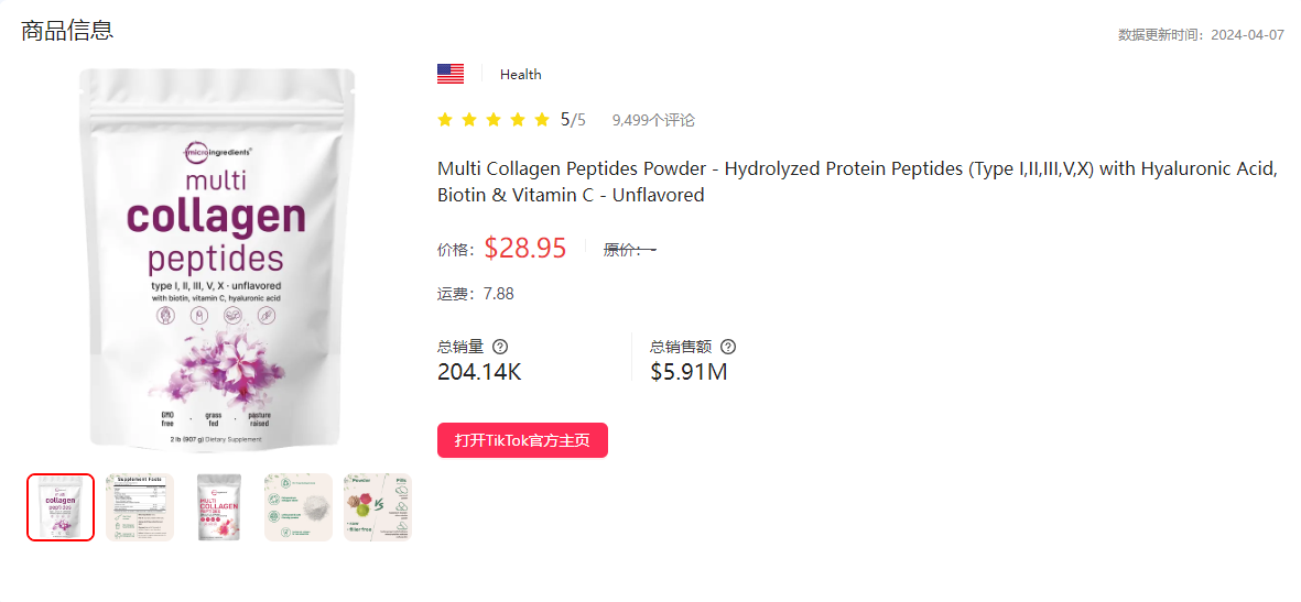 在过去几年,随着全球消费者对健康与养生的日益关注,保健品市场迎来了爆炸式的增长。而在这股趋势中,有一款产品在TikTok上以其惊人的销量脱颖而出——那就是“多重胶原蛋白肽粉(Multi Collagen Peptides Powder)”。