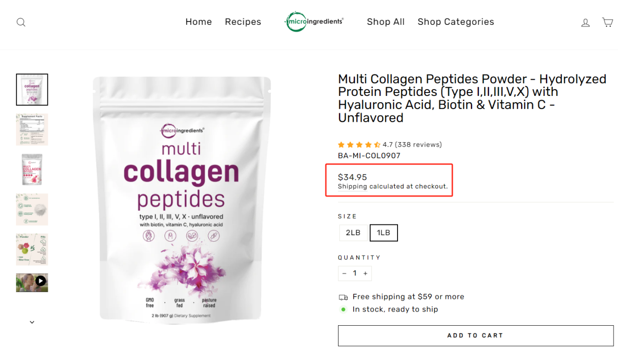 另外,优势的价格也是“多重胶原蛋白肽粉”能够通过TikTok Shop出圈的关键因素。Micro Ingredients在TikTok Shop的售价要比其在官网的售价便宜一大截,这就引发了消费者“捡便宜”的心理,从而促成交易。