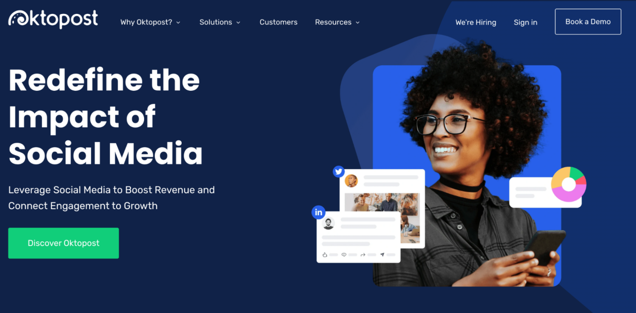 Oktopost专为B2B企业设计。最适合希望在社交媒体上扩大品牌影响力,并利用分析来推动内容策略和提高投资回报率的B2B企业使用。