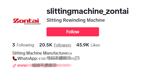 为了促进转化、及时接收到潜在客户的消息,这家机械工厂也将联系电话与海外官网链接,都放在了TikTok账号主页上。这样一来,一旦潜在客户对视频中展示的机器感兴趣,就可以通过上述方式及时地联系到中泰,降低了客户流失率,提高了客户转化率。