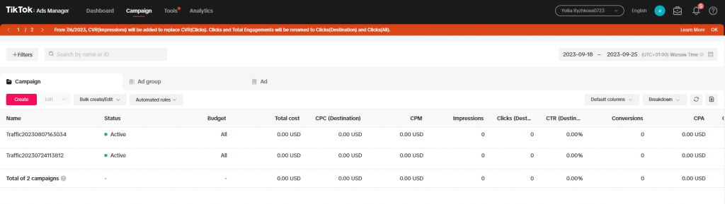 在这里,你能看到一个包含你的广告活动的表格,表中列出了名称、状态、预算、总成本、目标点击成本(CPC)、千次展示成本(CPM)、展示次数、目标点击数、每次行动成本(CPA)、转化数和点击率(CTR)。