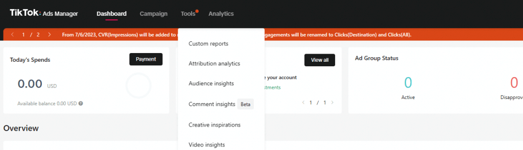 TikTok 广告管理器在菜单栏上有4个导航链接,分别为:仪表板、广告活动、工具和分析。但实际上,只有三个与TikTok广告分析有关。