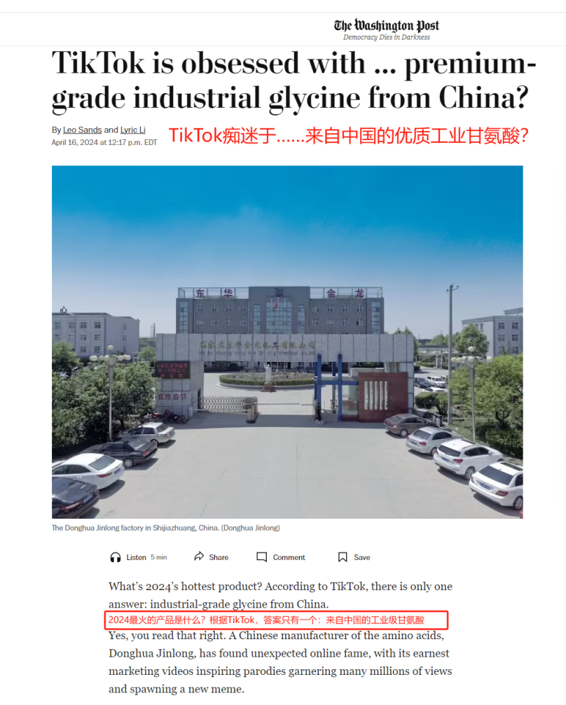 东华金龙的“顶流身份”,还受到了华盛顿邮报的认可,认为2024年最火的产品,就是来自中国的工业甘氨酸!