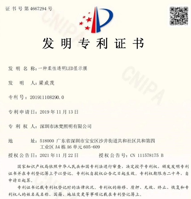 沐梵LED柔性透明膜(NanoFlex),喜获国家知识产权局《发明专利》证书