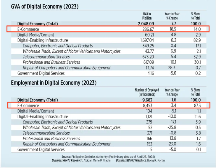 菲律宾统计局的数据显示,2023年菲律宾电子商务市场规模达到了2866.7亿比索,同比增长18.5%,在数字经济中占据了14%的份额。这一数据表明,尽管整体数字经济增速放缓,但电子商务的活力并未减退,反而成为推动菲律宾经济的重要动力。
