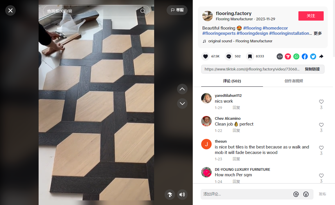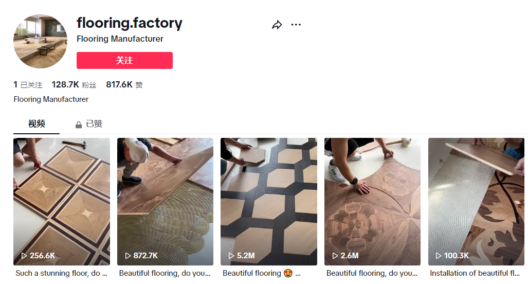 一家花式地板工厂通过TikTok企业号,发布其产品在车间组装和实际应用的视频,吸引了大量地板经销商和个人买家的关注。