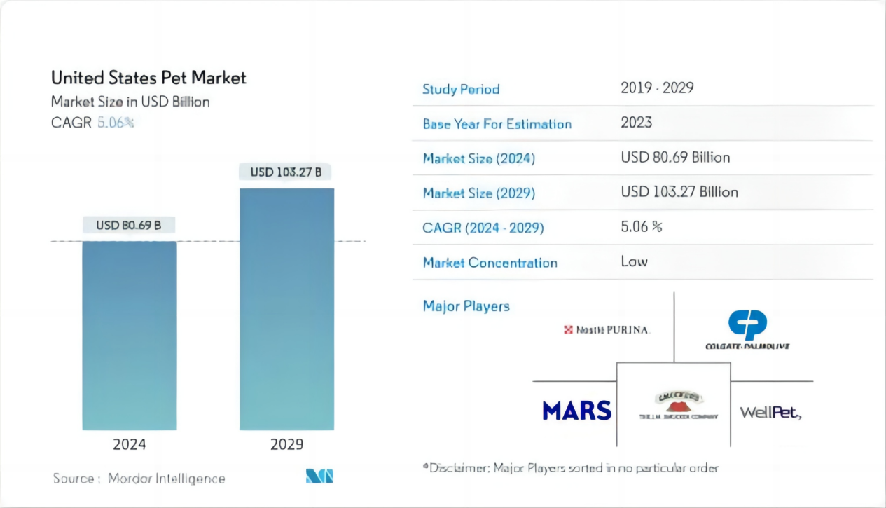 近年来,全球宠物市场规模不断扩大。据Modor Intelligence预测,2024年美国宠物市场规模将达到806.9亿美元,到2029年预计达到1032.7亿美元。