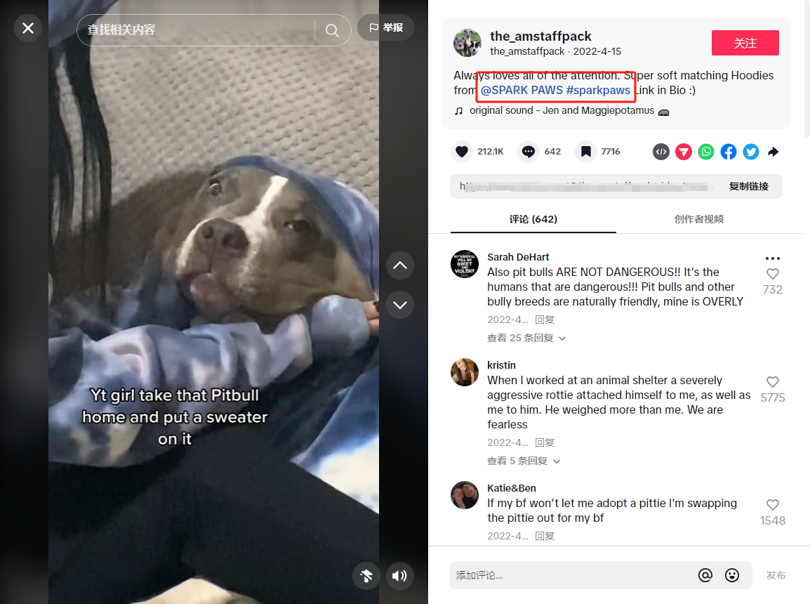 除此之外,Spark Paws也会联动一些宠物垂类达人种草打出营销组合拳,比如拥有102万粉丝的@the_amstaffpack,她就通过晒她和爱宠法斗的日常互动吸引粉丝。