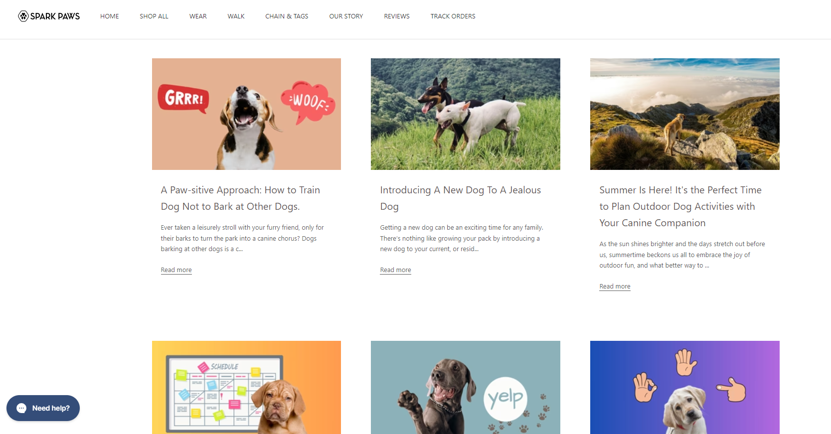 在Spark Paws的独立站上,还会定期更新一些关于宠物狗饲养知识、宠物狗训练、宠物狗创意活动等相关文章,并在文章中设置相关产品跳转链接,便于用户直接购买,达成转化。
