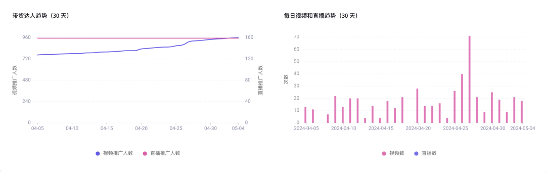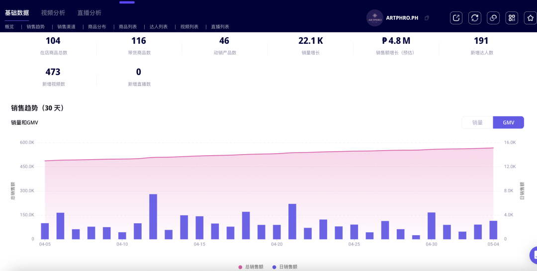 除了官方直播,短视频运营这些基本操作之外,达人带货也是TikTok营销的主线之一。ARTPHRO通过Echotik的数据平台,迅速积累了一批调性相匹配和带货数据优良的达人资源。过去30天,ARTPHRO新增带货达人191人,新增带货视频473个。